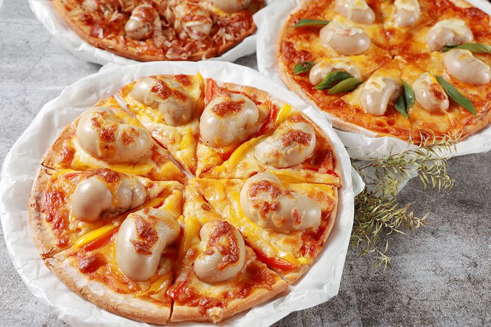 ▼可別小看這個雞佛披薩,雞佛是選用美國火雞,所以比一般台灣常見的雞佛大上5倍,每顆幾乎都有15克重以上,擺起來也特別壯觀!披薩上更是紮紮實實擺滿8顆大雞佛,對愛吃雞佛的人來說,咬一口就能享受噴漿滋味,再搭上脆脆的餅皮,實在是爽度滿點!