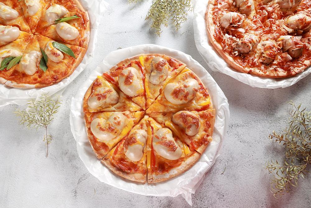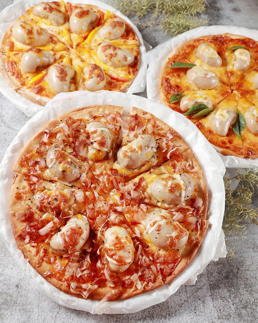 ▼「陽光皇后」也將雞佛做了不同口味搭配,包括日式柴魚、泰式風味和海鹽雞佛,其中最推薦的就是酸酸辣辣的泰式口味,吃起來不容易膩口。每塊披薩都有9吋大小,好奇雞佛在披薩上結合不同口味的話,就試著訂購看看吧!