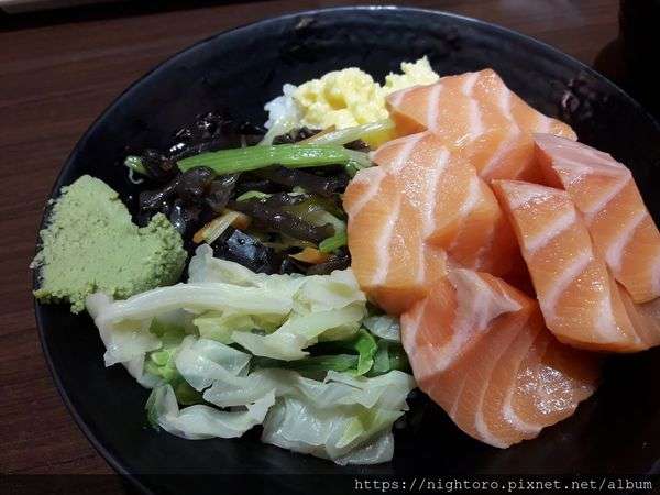 鮭魚丼飯 的鮭魚 也是很厚實 有高麗菜 木耳 和 蛋 當配菜