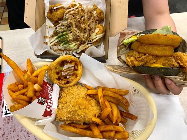 飯糰內包裹著細碎鮭魚鬆,還有些許香蔥點綴,帶點鍋巴感吃起來特別香,沾取盤上的蜂蜜芥末醬更好吃了,多了點甜味,風味更佳。