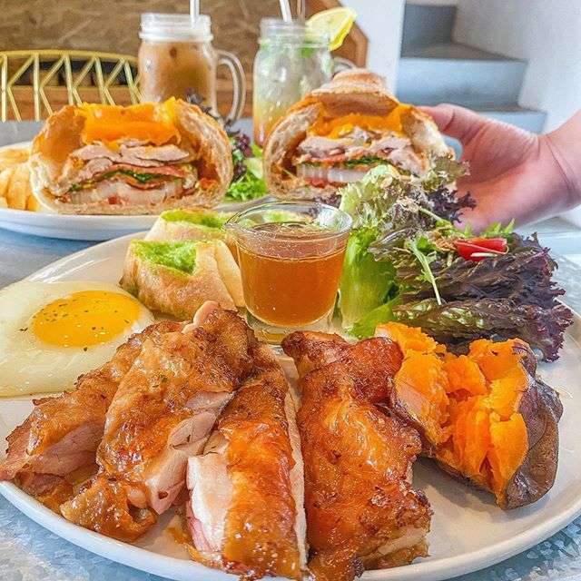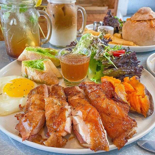 雞腿排外皮烤的超級欠吃🍗咬下去很嫩,肉汁也很多💦旁邊有法國麵包🥖、帶皮地瓜🍠、蛋🍳跟大量的生菜!沙拉的菜都用的非常好,很新鮮好吃而且不會苦苦的🥗