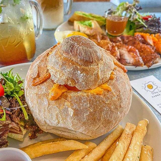 必點‼️超大大大推🤩拍了很久的照麵包也還是脆脆的啊🙈外型就是奶頭無誤(?)而且很好咬~特製奶頭麵包裡面料超級豐富!雞胸肉🐔、乳酪、蔬菜、番茄🍅、火腿...等,有點微辣非常開胃!真的好喜歡啊~💗旁邊有薯條🍟跟生菜沙拉🥬