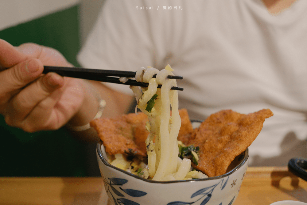 店家的烏龍帶有QQ彈性,上面的蛋拌添加了自制蛋黃醬,讓整體的口感更為濃郁之外,麵條上黑黑的是芝麻醬,原本很擔心吃起來口味很不習慣,可是竟然意外的好吃!