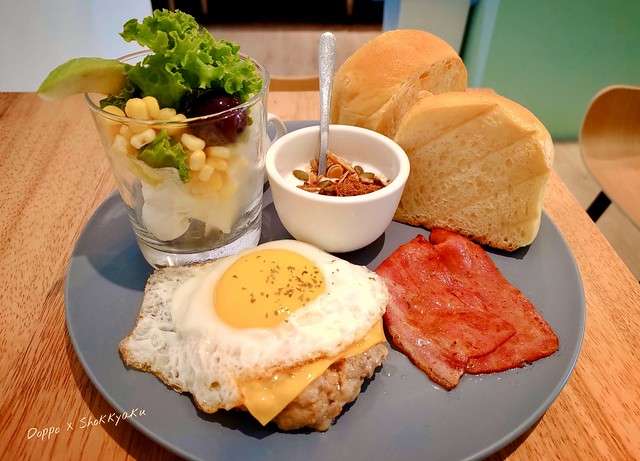這份拼盤除了主食的豬肉漢堡肉外,還有兩片培根、沙拉、兩片小吐司跟優格,非常的豐盛