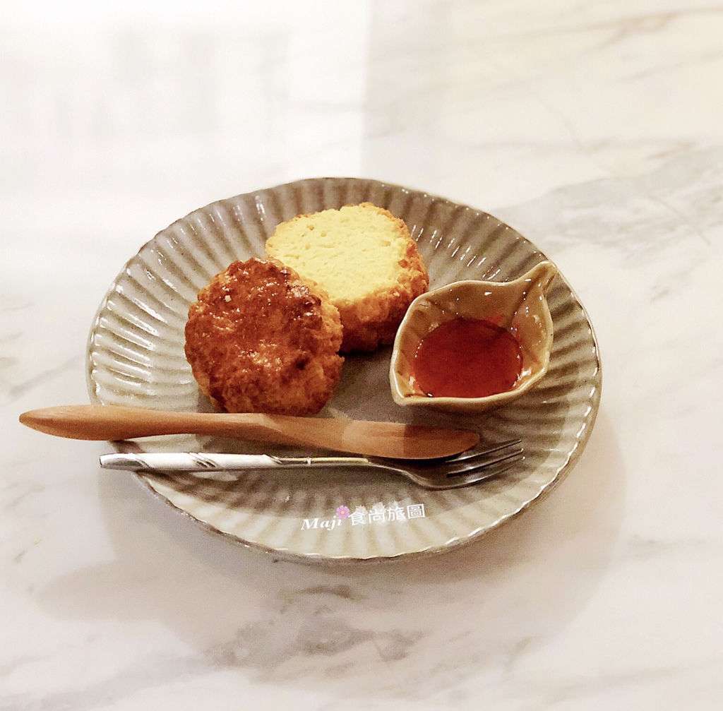 手工司康佐蜂蜜:司康內層濕軟外層鬆酥鬆,塗抹微量的蜂蜜,清甜的口感。