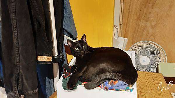 這位黑貓大大就大喇喇的躺在待售的襪子盒內