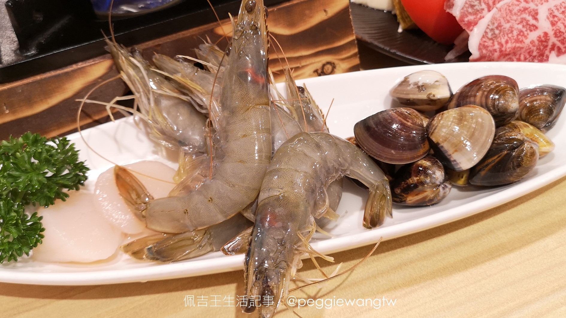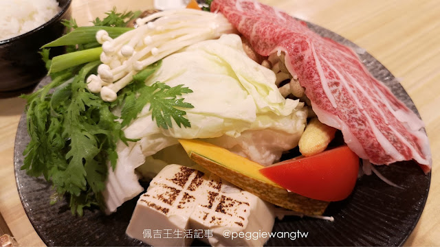 圖:菜盤包含日本大蔥、洋蔥絲、紅蘿蔔塊、白蘿蔔丁、高麗菜、杏鮑菇、金針菇、香菇、南瓜片、嫩豆腐(微煎)、玉米筍*1、牛番茄1/4、日本水菜、文蛤*2、金桔1/2顆