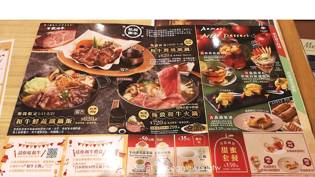菜單:樂雅樂不定時會推出期間限定的季節菜單(雖然他本行是賣西餐XD),看看這次菜單內容吧~(12/03-02/21點我看官網菜單1、菜單2)。另外,還有限定推出的《和牛醬燒紙鍋》(12/03-01/10)$ 620、《和牛鮮蔬鐵鍋飯》(01/11-02/21)$ 620、《青森蘋果&草莓百匯甜點杯》(01/11-02/21)$ 180,可以趁活動期間去嚐鮮~