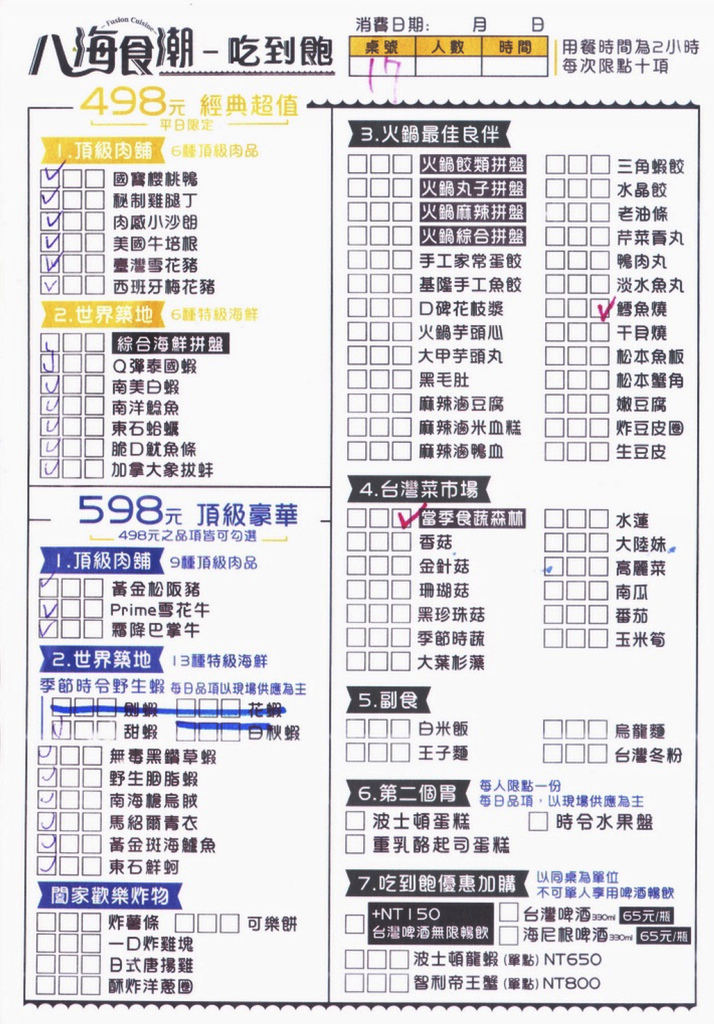 「八海食潮當代鍋物」吃到飽點餐單,用餐兩小時,每次現點十項。