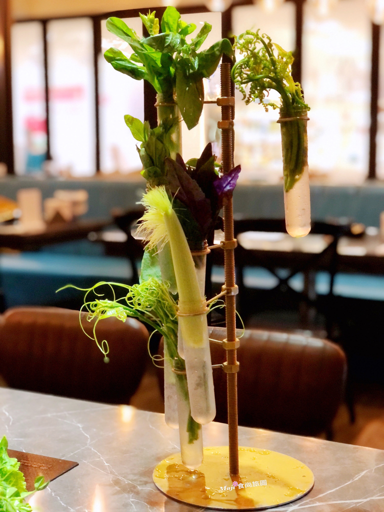 食蔬森林以冰水試管裝設新鮮的當季食蔬,保存其鮮度,滿足了視覺效果,玉米筍、過貓等季節食蔬涮鍋美味營養加分。