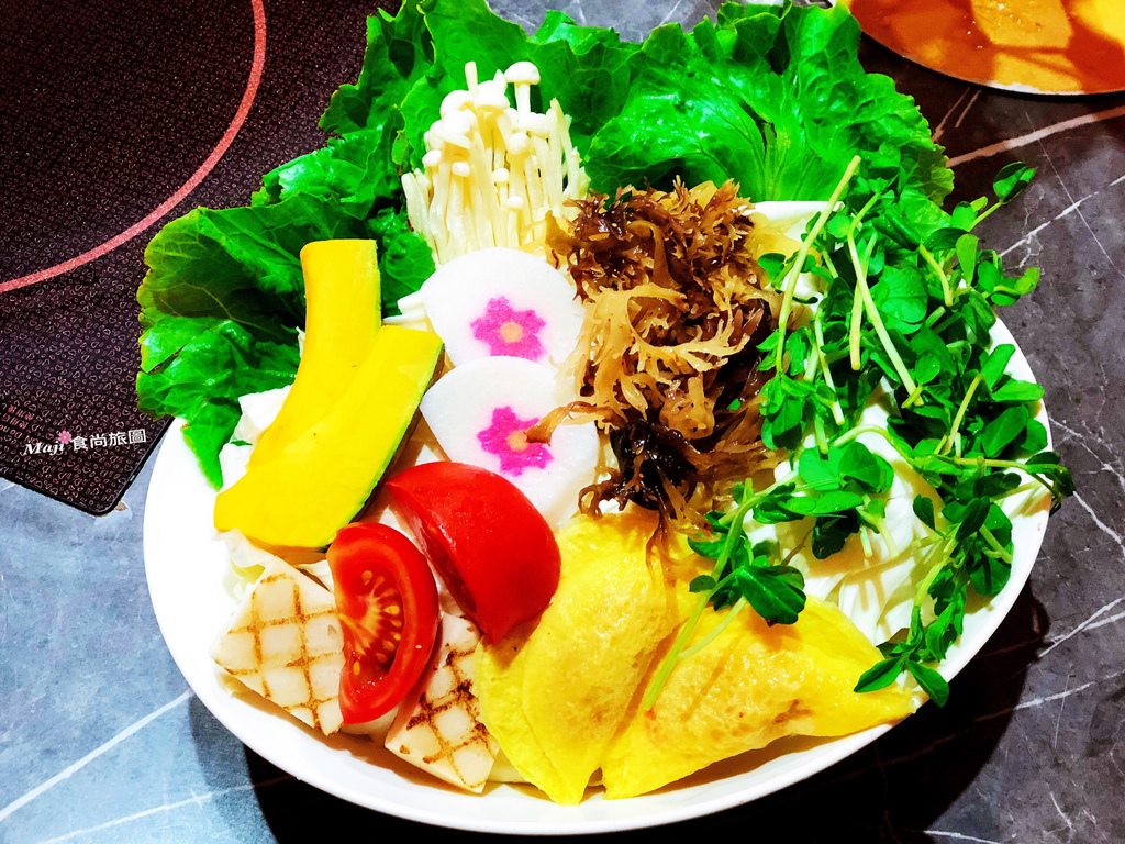 擺放整齊的火鍋食材,金針菇、南瓜、番茄、鱈魚燒、魚餃、還有一般火鍋少見的大葉杉藻,分量十足。而且都是我愛吃的,實在開心。