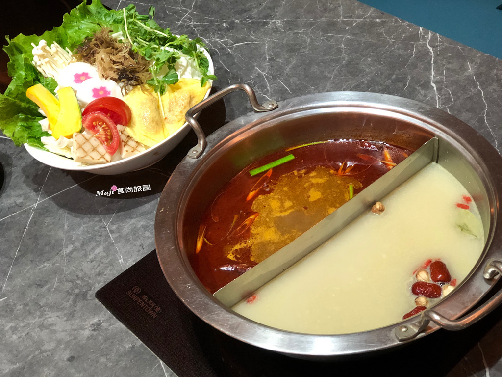 湯頭是火鍋的精髓,「八海食潮當代鍋物」是鴛鴦鍋的設計。有老火豚骨鍋、招牌奶香鍋、食神麻辣鍋、素食香菇鍋、韓式泡菜鍋、東北酸白菜鍋、海味昆布鍋、養身藥膳鍋、健康番茄鍋,九種任選二。我們選了最受歡迎的食神麻辣鍋和老火豚骨鍋。