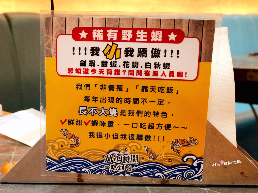 綜合海鮮拼盤、Q彈泰國蝦、南洋鯰魚、東石蛤蠣、甜蝦、無毒黑鑽草蝦、南海槍烏賊、馬紹爾青衣、東石鮮蚵等,平常很少吃的到的海鮮,一次嘗鮮。最喜歡無毒黑鑽草蝦、甜蝦,雖然小隻但肉質緊緻超鮮甜,口感鮮美。